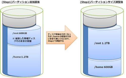 “VMware (ESXi) で増量したディスクをLVMに組み込む方法”では、新規割り当てディスクを既存LVMに組み込む方法をまとめた。Step.2では、LVM管理下の各LVの容量を調整する。 現在の状態と目標 現在はStep.1の状態。Step.2のようにディスク容量の調整を行いたい…